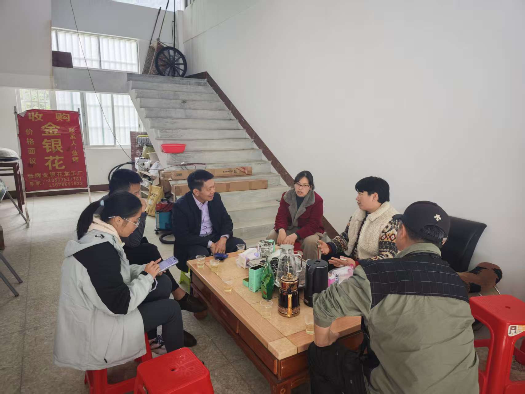 专家团队在加方乡蓝辉金银花加工厂走访